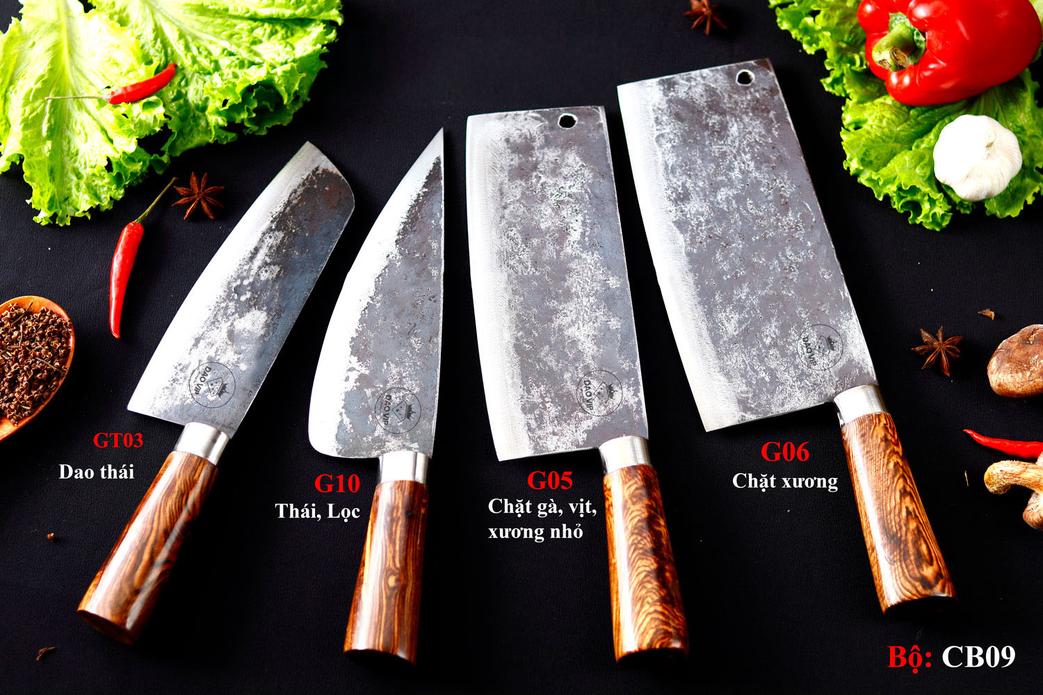 - BỘ DAO BẾP CB09 cán cẩm. được rèn thủ công từ thép nhíp xe ô tô nga, thép nhíp đỏ, thép nhíp ifa nguyên khối nên rất sắc bén, dẻo dai, bền....và dễ mài lại...bộ sản phẩm gồm 4 sản phẩm đáp ứng đầy đủ các tính năng, 1 sản phẩm dao chặt xương, 1 sản phẩm chuyên chặt gà vịt, một dao chuyên thái bản và một sản phẩm dao bầu lọc tất cả đều được thiết kế gọn gàng đẹp. BỘ DAO BẾP CB09 cán cẩm sản phẩm rất thích hợp và được sử dụng để thái rau, thịt....cho vết cắt đẹp, ngọt, mượt mà và vuông vắn, đạt thẩm mỹ cao. đáp ứng tất cả các công việc bếp hằng ngày như chặt xương to cứng, chặt gà vịt, thái thịt, rau củ quả, lọc, róc thịt cá, cắt tỉa hoa quả.....