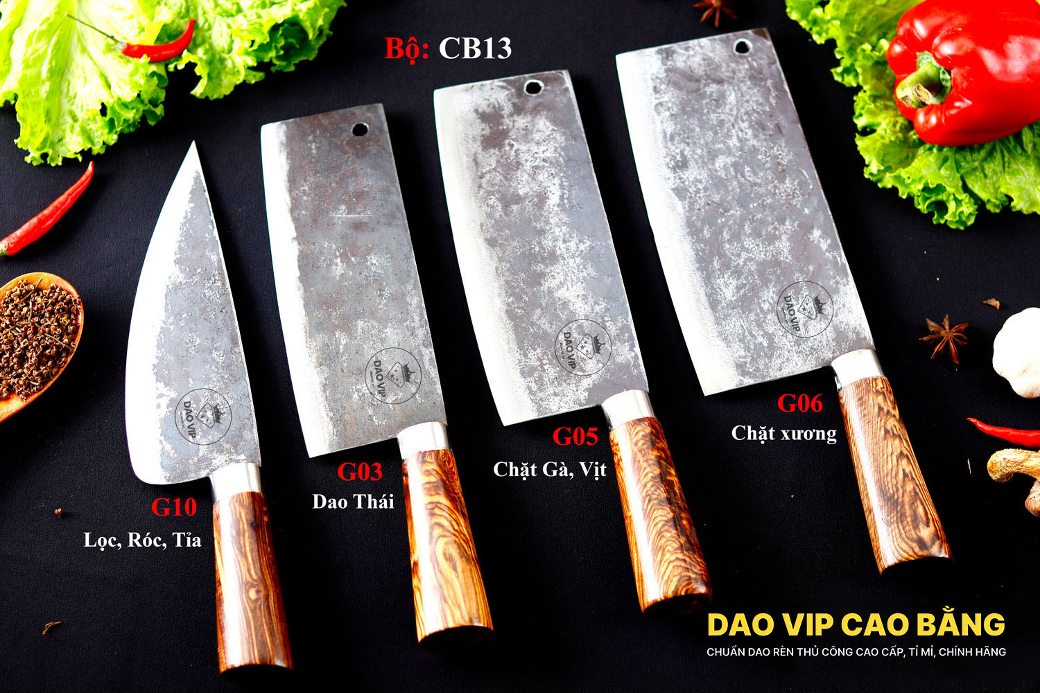 BỘ DAO BẾP CB13 cán cẩm là một combo sản phẩm của DAO VIP CAO BẰNG hàng chuẩn dao truyền thống Cao Bằng, tỉ mỉ, cao cấp, chính hãng!