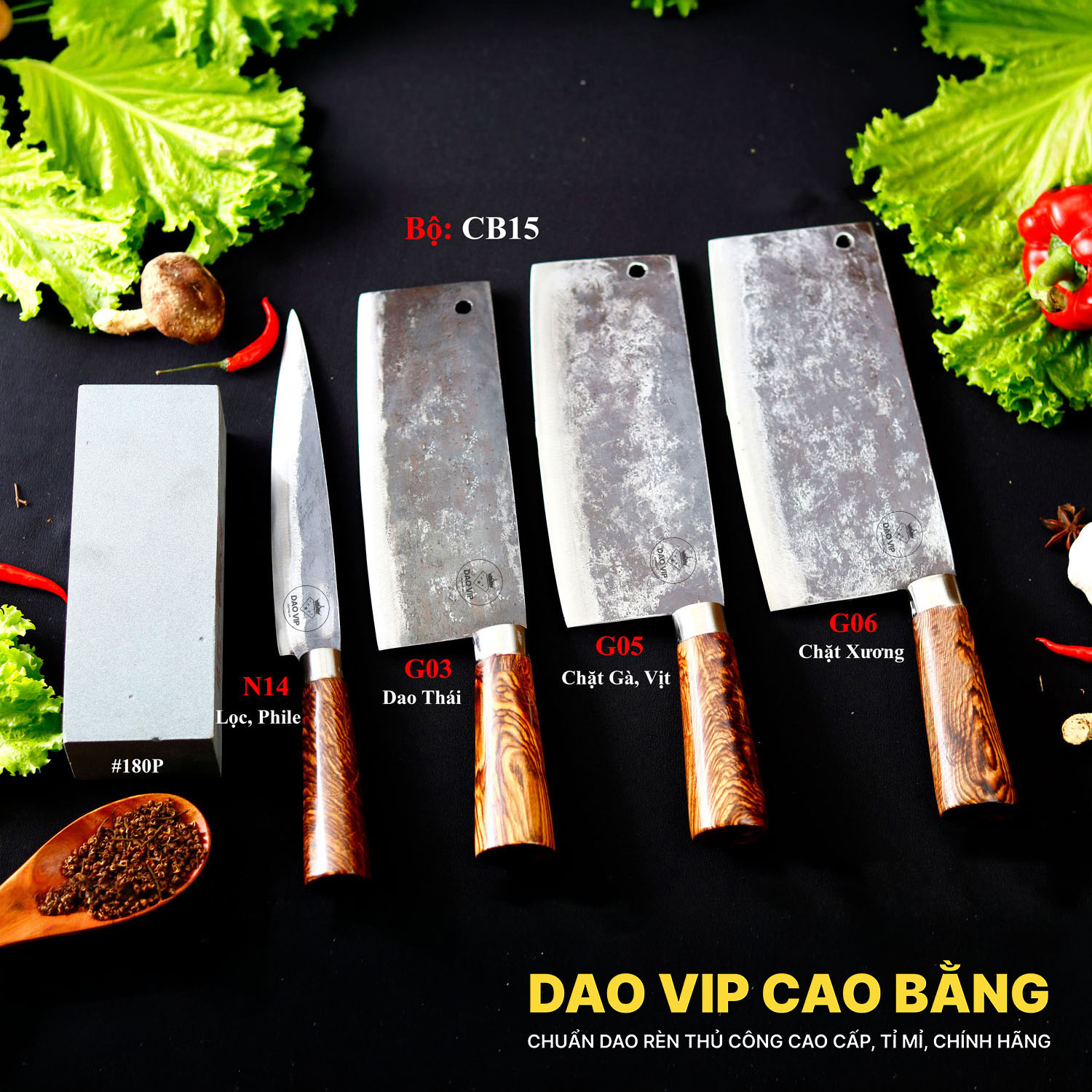 BỘ DAO BẾP CB15 cán cẩm là một combo sản phẩm của DAO VIP CAO BẰNG hàng chuẩn dao rèn truyền thống Cao Bằng, tỉ mỉ, cao cấp, chính hãng!