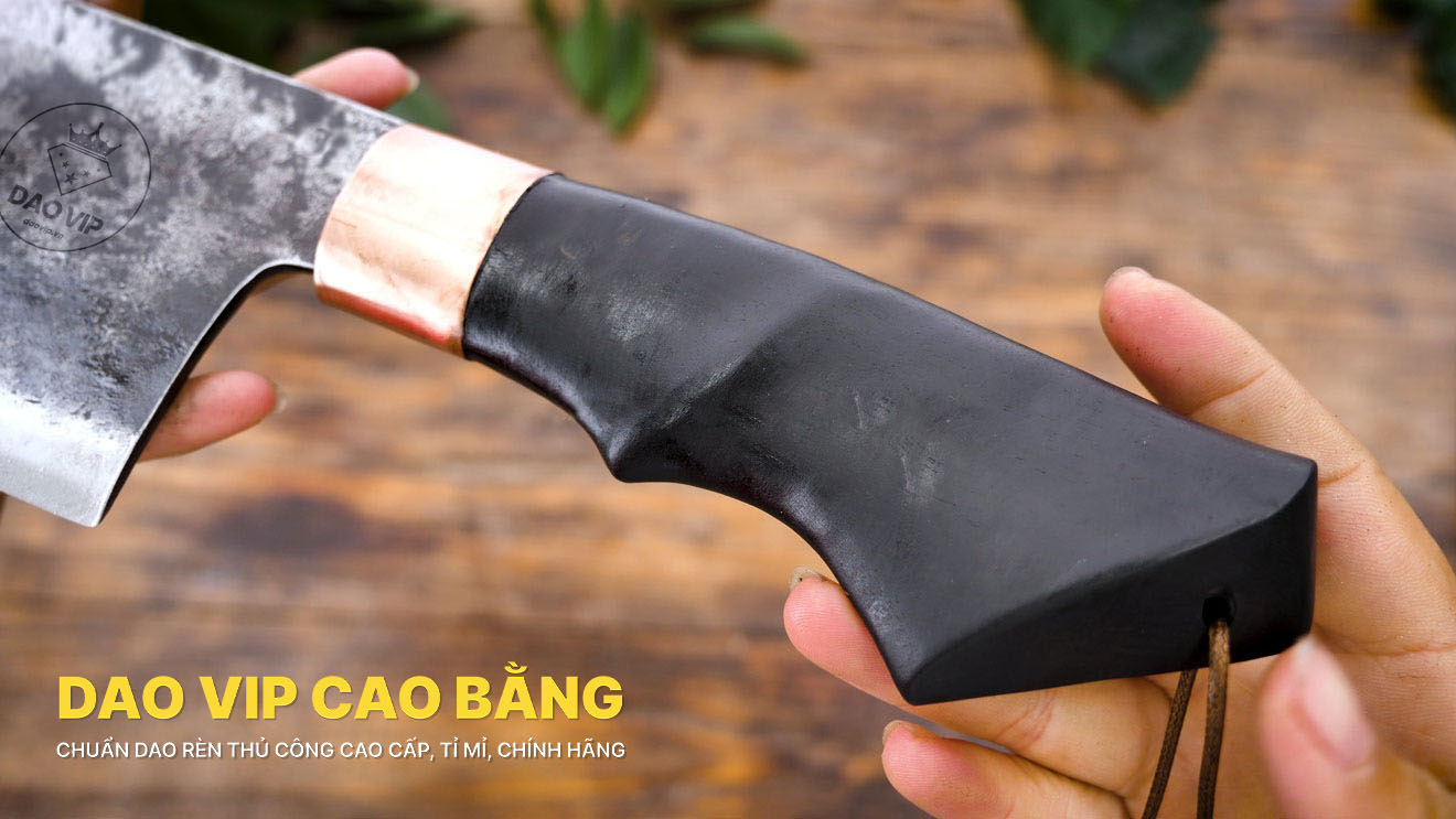 3. Phần cán Dao chặt gà CG04T được làm từ gỗ mun là loại gỗ thường được sử dụng trong sản xuất đồ mỹ nghệ. Bên cạnh tính thẩm mỹ thì độ dai bền của gỗ mun là yếu tố hàng đầu để Dao Vip Cao Bằng lựa chọn nguyên liệu làm cán dao. Do đặc thù dao bếp khi sử dụng phải thường xuyên tiếp xúc nước nên với ưu điểm hạn chế mủn, mục khi gặp nước như các loại gỗ thông thường, cộng với sự tỉ mỉ, cẩn thận của thợ trong công đoạn tra cán nên dao cán gỗ mun đảm bảo độ bền và an toàn tuyệt đối cho người sử dụng.