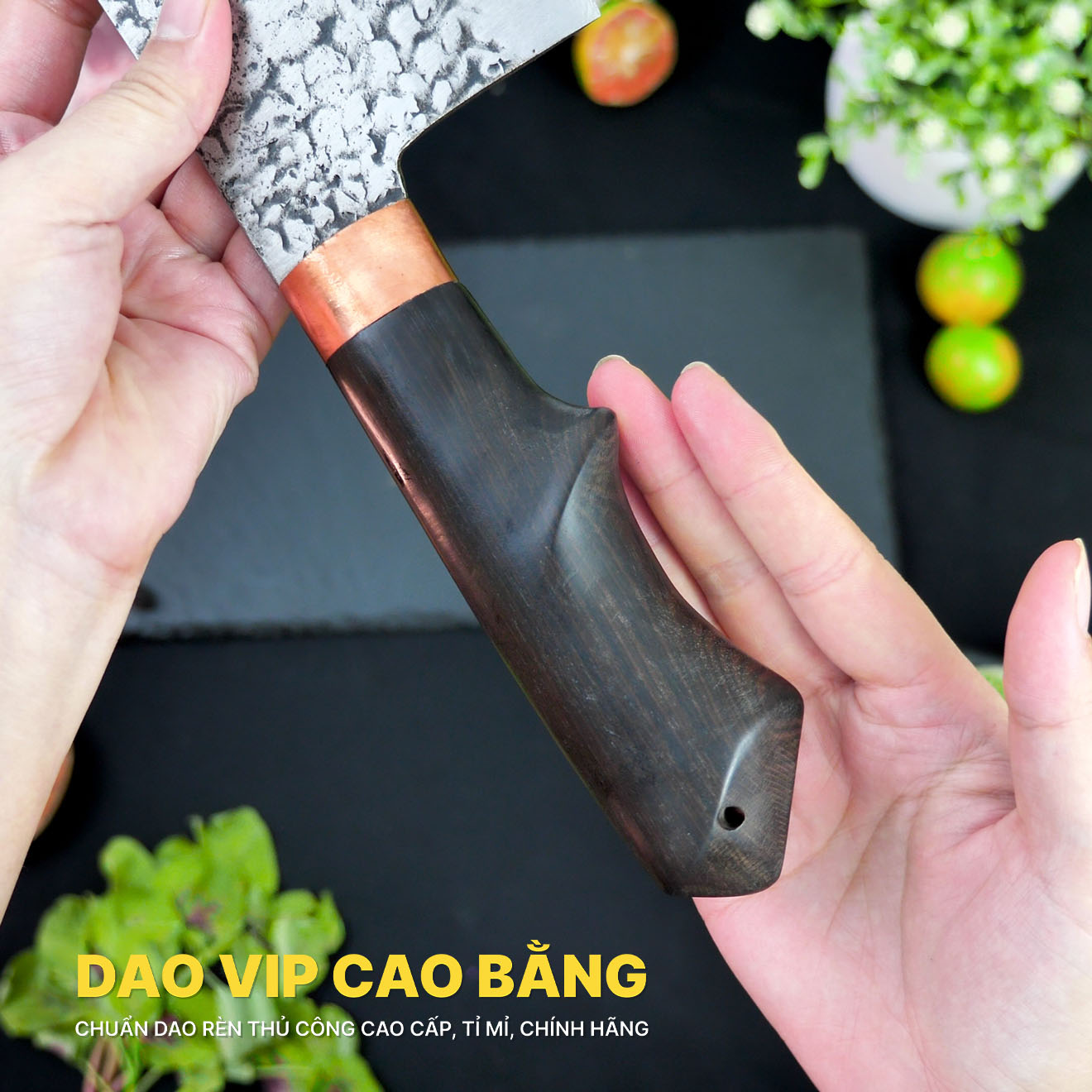 Ngoài ra phần cán dao chặt gà CG04T được thiết kế theo dáng cầm của tay làm cho việc cầm nắm chắc chắn và êm tay . Khâu dao được làm bằng đồng đỏ vừa tăng thẩm mỹ vừa bền cơ học. Keo liên kết đươc chúng tôi Dao Vip Cao Bằng lựa chọn là keo A B 2 thành phần nổi tiếng với độ liên kết bám dính cao đảm bảo cho dao bếp của bạn bền đẹp, an toàn.