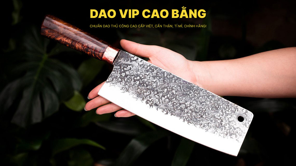 Dao chặt gà dập hoa văn - G05TDD Lựa chọn nguyên liệu là nhíp ô tô được các thợ rèn gia công tỉ mỉ từ lưỡi dao cho đến cán dao đảm bảo việc băm chặt xương sắc - ngọt. Các sản phẩm của Dao Vip Cao Bằng thợ rèn đều sử dụng than củi khi nung thép cũng như tôi dao để đảm bảo lưỡi dao khi ra lò sắc bén và bền lâu. Được đập hoa văn 1 mặt tỉ mỉ đẹp mắt, hạn chế bám dính thực phẩm