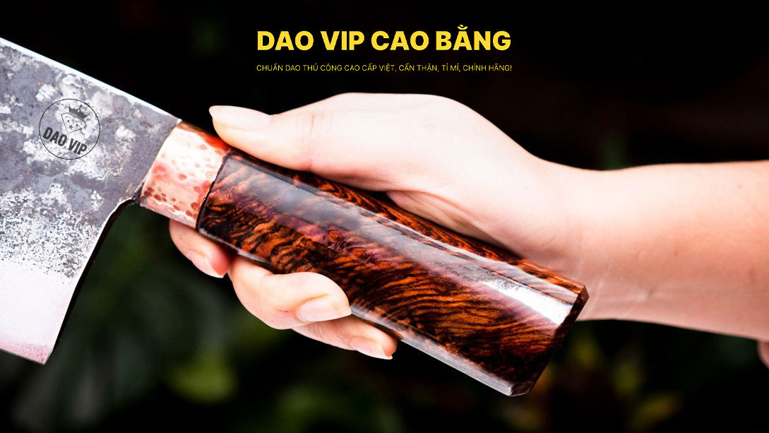 Phần cán Dao chặt gà dập hoa văn - G05TDD được làm từ gỗ cẩm chỉ là loại gỗ thường được sử dụng trong sản xuất đồ mỹ nghệ. Bên cạnh tính thẩm mỹ thì độ dai bền của gỗ cẩm chỉ là yếu tố hàng đầu để Dao Vip Cao Bằng lựa chọn là nguyên liệu làm cán dao. Do đặc thù dao bếp khi sử dụng phải thường xuyên tiếp xúc nước nên với ưu điểm không mục, không mủn khi gặp nước như các loại gỗ thông thường, cộng với sự tỉ mỉ, cẩn thận của thợ trong công đoạn tra cán nên dao cán gỗ cẩm chỉ đảm bảo độ bền và an toàn tuyệt đối cho người sử dụng.