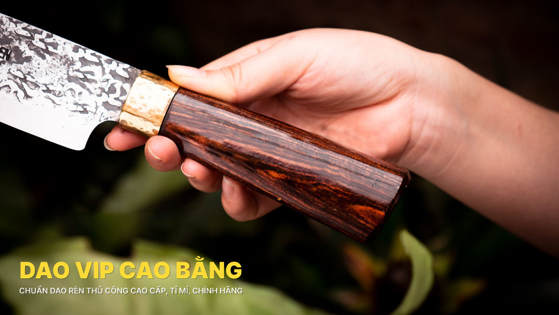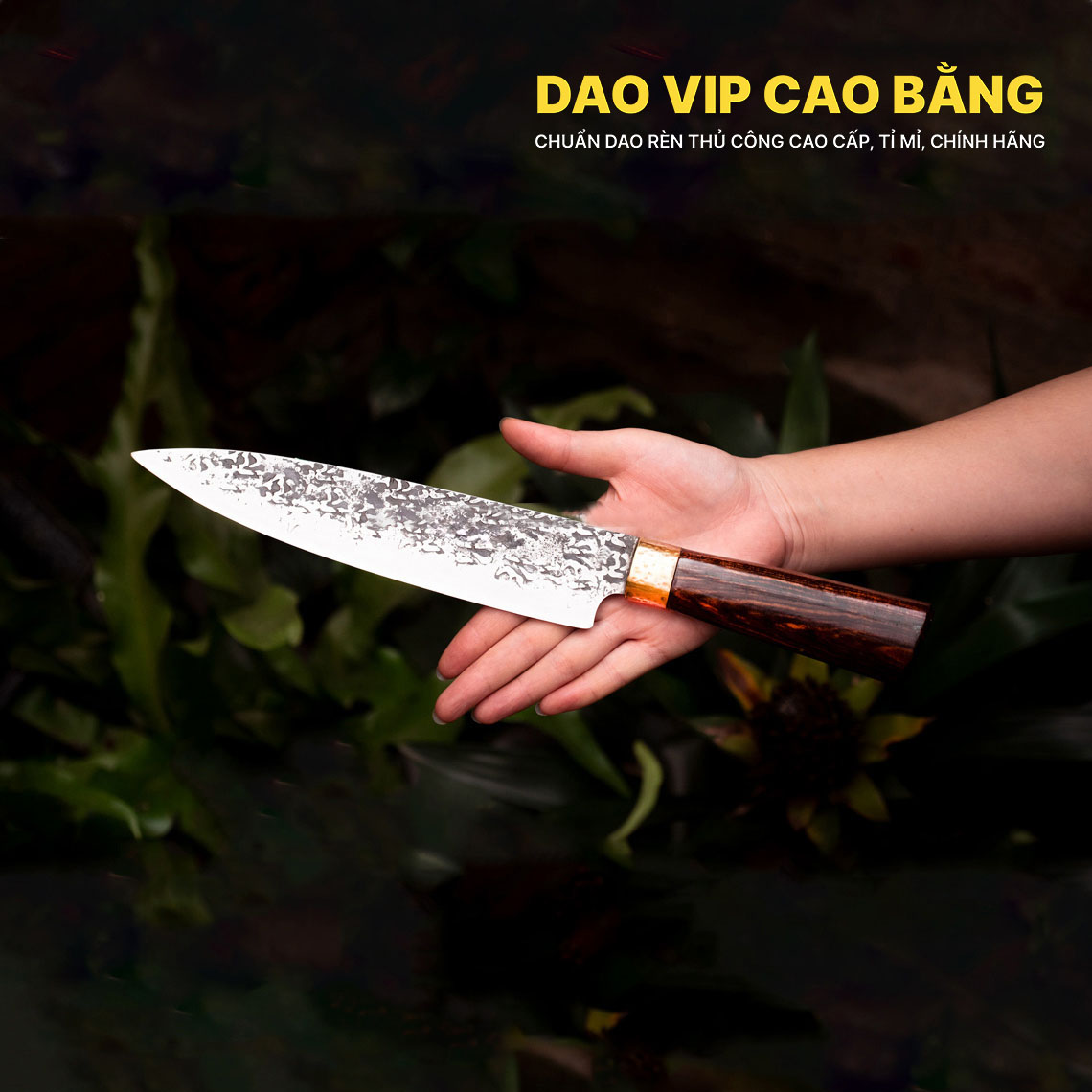 Dao lọc cao cấp - DLD Lựa chọn nguyên liệu là nhíp ô tô được các thợ rèn giỏi gia công tỉ mỉ từ lưỡi dao cho đến cán dao đảm bảo việc thái lọc sắc - ngọt. Các sản phẩm của DAO VIP CAO BẰNG thợ rèn đều sử dụng than củi khi nung thép cũng như tôi dao để đảm bảo lưỡi dao khi ra lò sắc bén và bền lâu. Nét đặc biệt của mẫu dao này là bề mặt lưỡi dao được thợ rèn giỏi của DAO VIP CAO BẰNG đập rèn hoa văn tỉ mỉ đẹp mắt tạo nét khác biệt cho từng con dao và bề mặt hoa văn này còn có tác dụng chống dính bám thực phẩm khi cắt, thái.