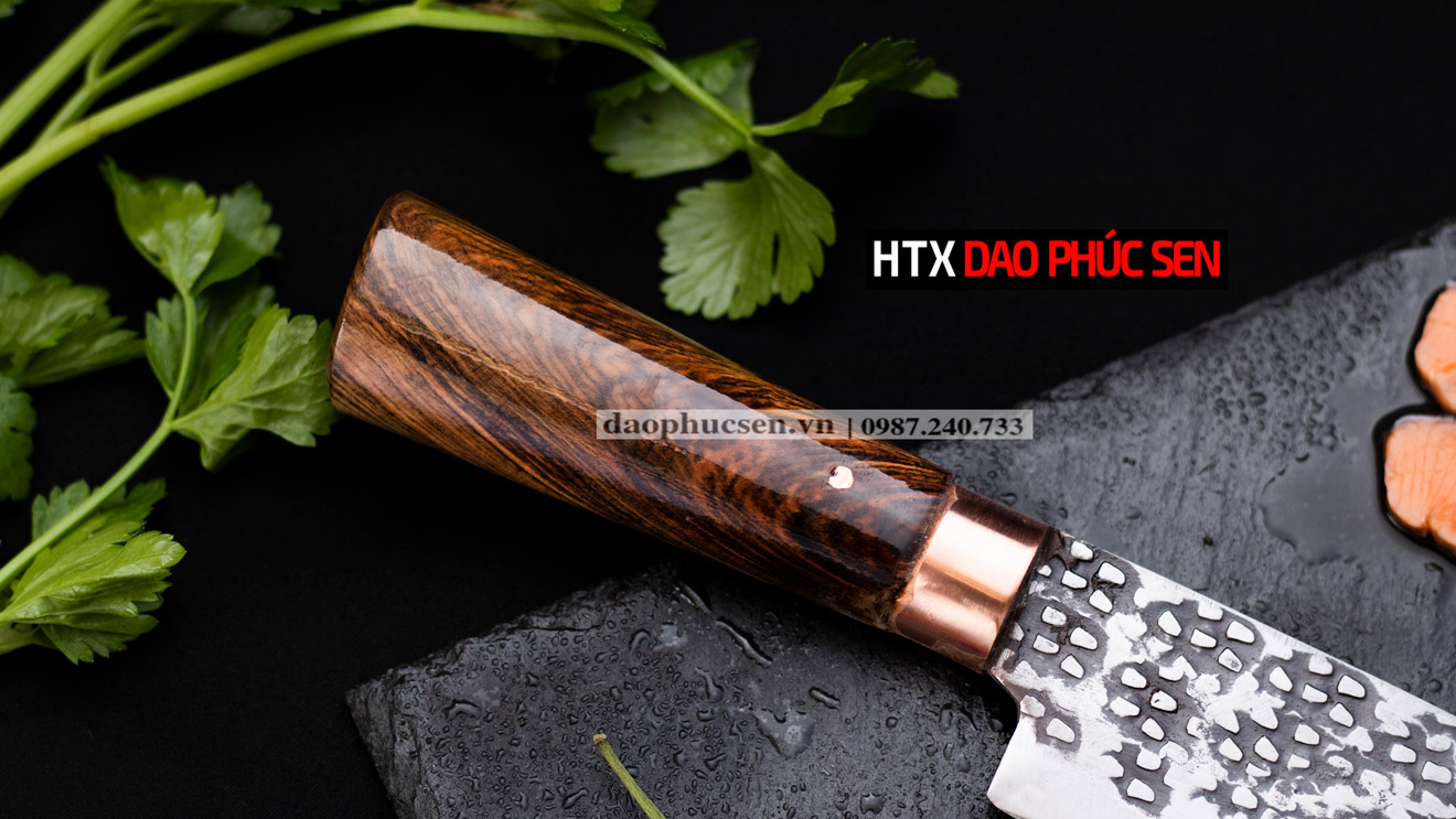 Phần cán Dao lọc thái hoa văn - G17TDD được làm từ gỗ cẩm chỉ là loại gỗ thường được sử dụng trong sản xuất đồ mỹ nghệ. Bên cạnh tính thẩm mỹ thì độ bền của cẩm chỉ là yếu tố hàng đầu để HTX Dao Phúc Sen lựa chọn là nguyên liệu làm cán dao. Do đặc thù dao bếp khi sử dụng phải thường xuyên tiếp xúc nước nên với ưu điểm không mục, không mủn khi gặp nước như các loại gỗ thông thường, cộng với sự tỉ mỉ, cẩn thận của thợ trong công đoạn tra cán nên dao cán gỗ cẩm chỉ đảm bảo độ bền và an toàn tuyệt đối cho người sử dụng.