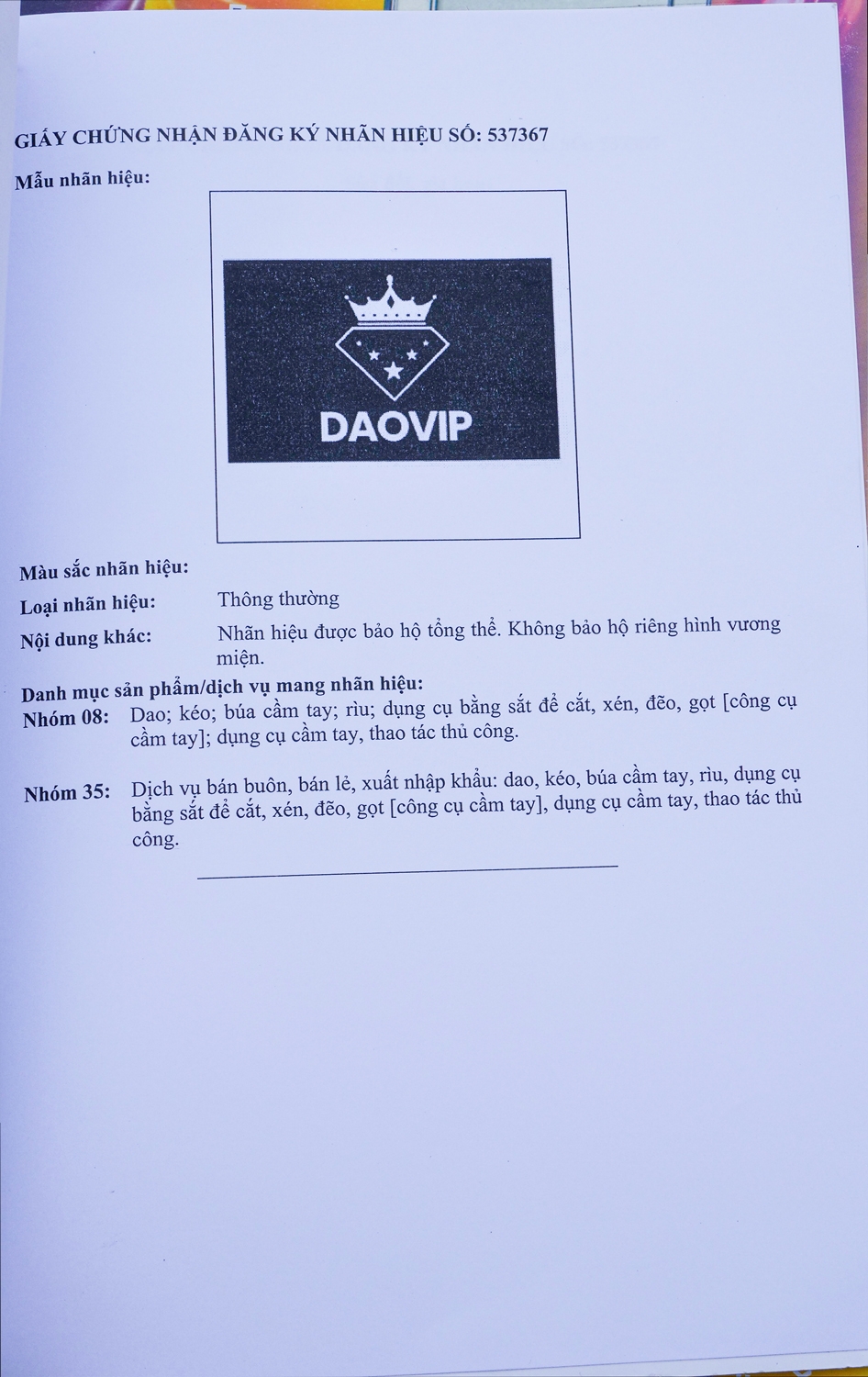 2. Giấy bảo hộ Thương hiệu được bảo hộ tại cục sở hữu trí tuệ Việt Nam số 537367.