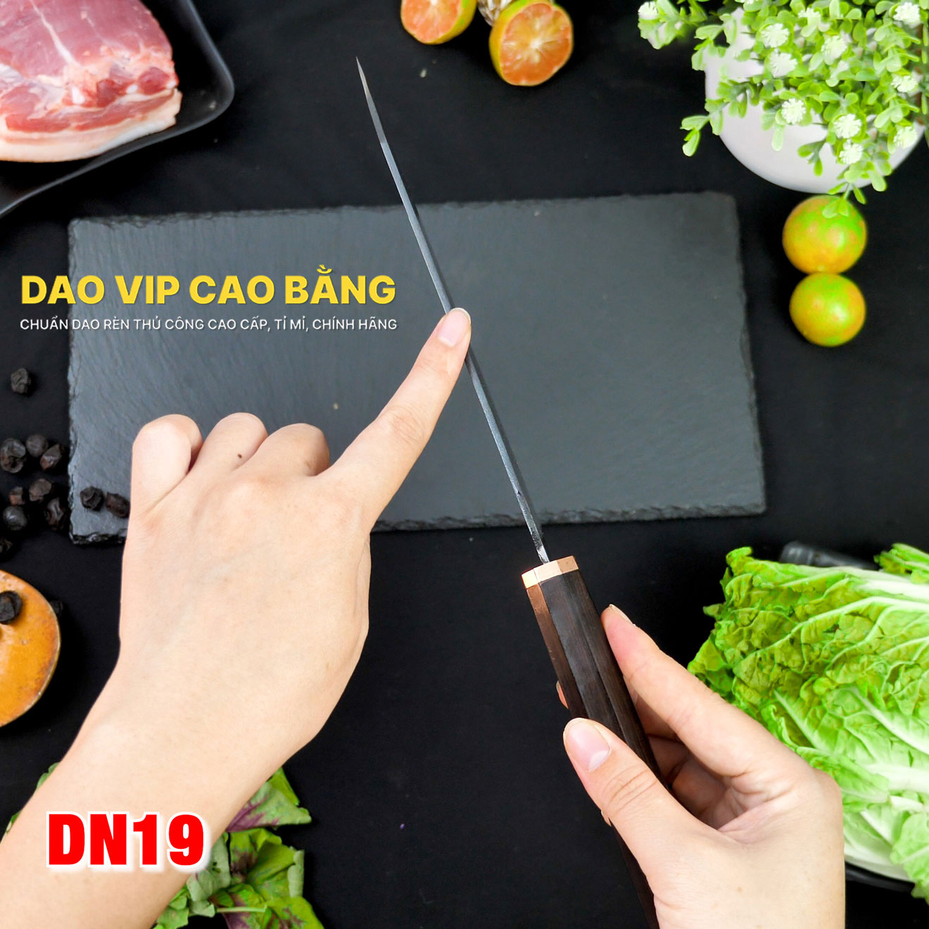 Dao thái lọc DN19 Lựa chọn nguyên liệu là nhíp ô tô được các thợ rèn giỏi gia công tỉ mỉ từ lưỡi dao cho đến cán dao đảm bảo việc thái lọc sắc - ngọt. Các sản phẩm của DAO VIP CAO BẰNG đều sử dụng than củi khi nung thép cũng như tôi dao để đảm bảo lưỡi dao khi ra lò sắc bén và bền lâu.
