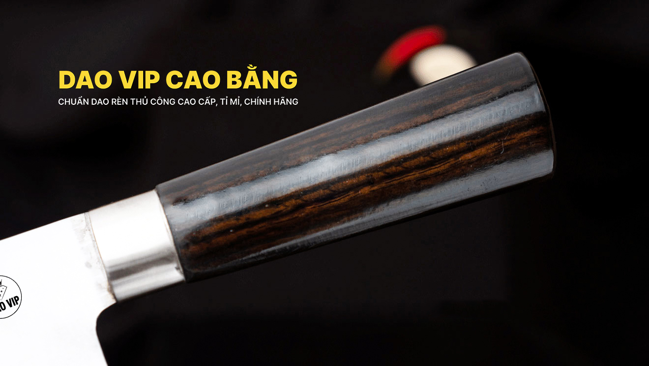 Phần cán Dao thái phúc sen không rỉ - TKM được làm từ gỗ mun là loại gỗ thường được sử dụng trong sản xuất đồ mỹ nghệ. Bên cạnh tính thẩm mỹ thì độ dai bền của gỗ mun là yếu tố hàng đầu để DAO VIP CAO BẰNG lựa chọn nguyên liệu làm cán dao. Do đặc thù dao bếp khi sử dụng phải thường xuyên tiếp xúc nước nên với ưu điểm không mục, không mủn khi gặp nước như các loại gỗ thông thường, cộng với sự tỉ mỉ, cẩn thận của thợ trong công đoạn tra cán nên dao cán gỗ mun đảm bảo độ bền và an toàn tuyệt đối cho người sử dụng.