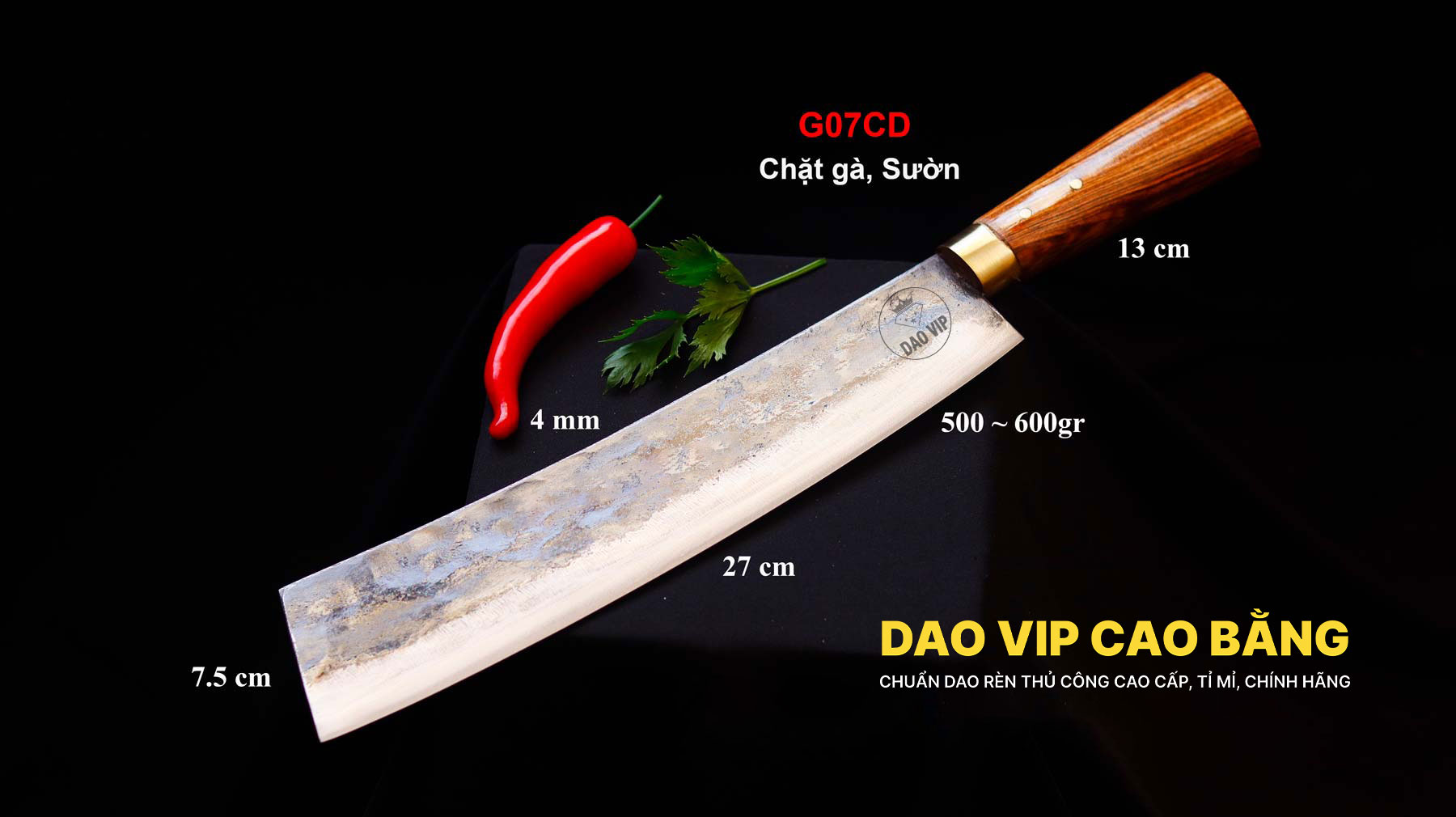 Dao tông chặt gà mới G07CD cán cẩm khâu đồng được sản xuất theo tiêu chuẩn riêng biệt của DAO VIP CAO BẰNG phục vụ cho các công việc như chặt gà, vịt và các loại xương nhỏ có đường kính dưới 0.5 cm để mang lại trải nghiệm tốt nhất cho khách hàng. Với sản phẩm Dao tông chặt gà mới G07CD cán cẩm khâu đồng,